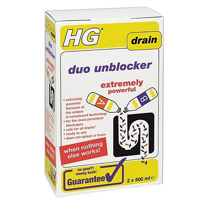 HG Duo Drain Unblocker has been developed especially for the most persistent blockages in your kitchen, bathroom or utility drains. A build caused by grease, food remnants, hair, toothpaste and soap remnants. Hg Duo Unblocker is based on a unique 2 component technology (A+B) that can remedy different types of persistent blockages effectively. Depending on the application, i.e in a kitchen or bathroom drain, you need different doses from bottle A and bottle B.