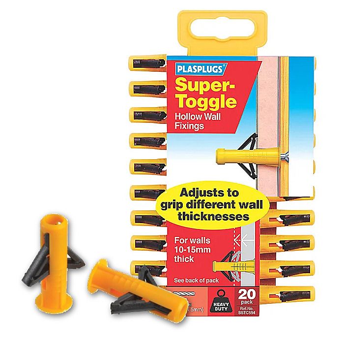 Extra strong toggle fixings with expanding wings, which spread over a wide area making them perfect for use in plasterboard and other sheet materials. Suitable for use in hollow walls that are around 10-16mm thick, this pack includes drill and screw guide.