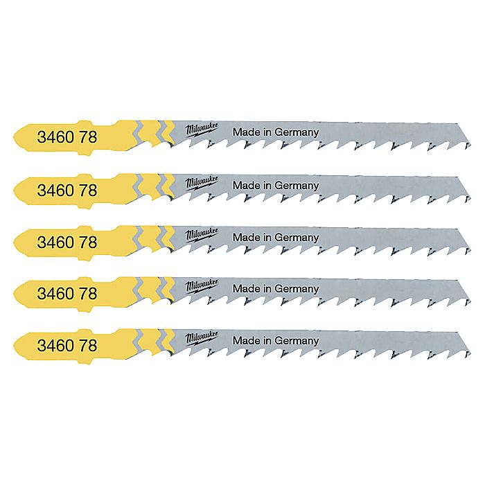 The Milwaukee 4932346078 is a pack of 5 jigsaw blades that make fast, curved cuts through softwood, plywood, chipboard and similar woods up to 50mm thick. Each jigsaw blade is ideal for scroll work, tight radius cuts and detailed shaping tasks with their narrow blade body and improved manoeuvrability. With a T-shank design, these blades and be quickly secured in compatible jigsaws.