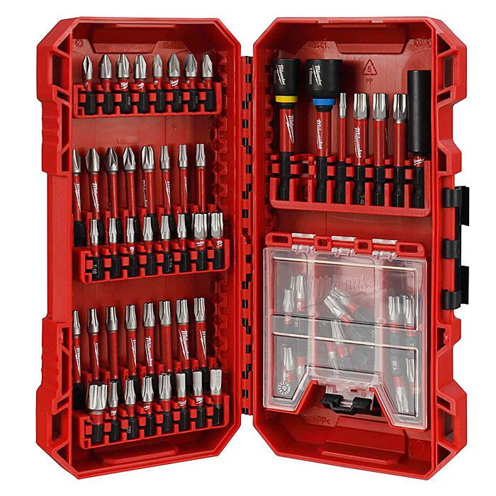 This Milwaukee Shockwave accessory set contains fifty-two 25mm length and twenty 50mm length Phillips, Pozidriv, Torx and Hex bits along with two 48mm length nut drivers and a 60mm magnetic bit holder for working with a massive of fixings on the job.